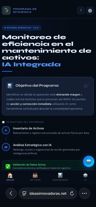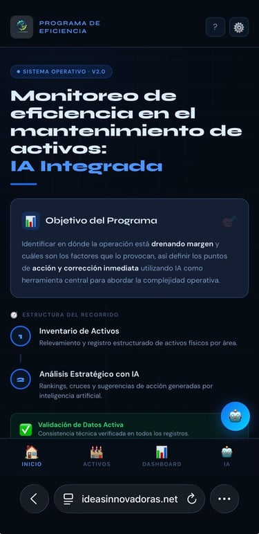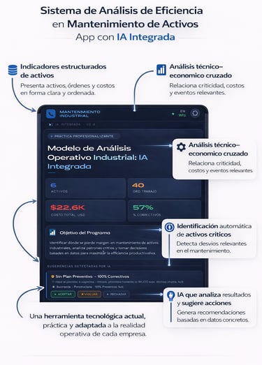Herramienta de monitoreo y análisis de activos con IA integrada. Permite visualizar rankings de costos, criticidad, horas de parada y correctivos — y genera sugerencias de acción basadas en los datos reales de la operación.